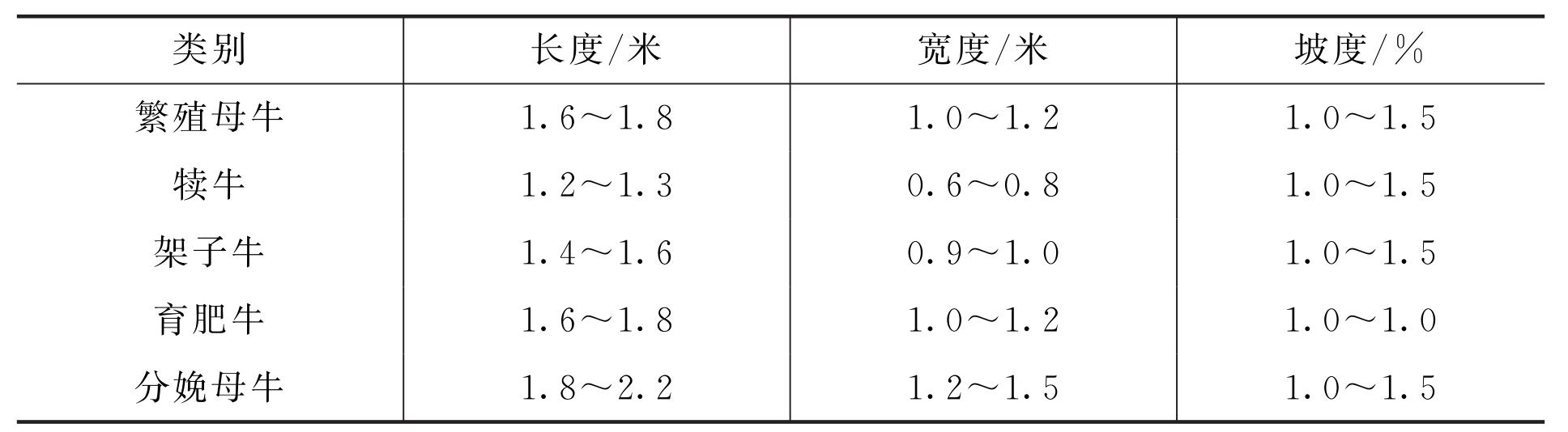 牛床的规格直接影响到牛舍的规格,不同类型的牛需要的牛床规格不同。见表2-2。