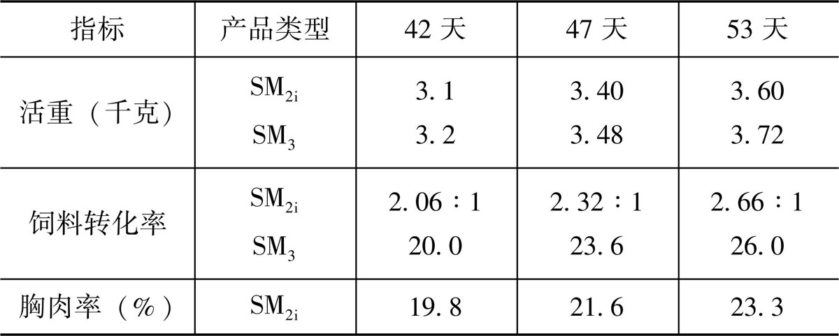 樱桃谷SM3型父母代种鸭平均开产日龄175天,平均开产体重3200克;50周龄平均产蛋260枚。商品鸭47日龄平均体重3480克,料肉比2.28∶1,成活率98%。商品代具体生产性能如表1。