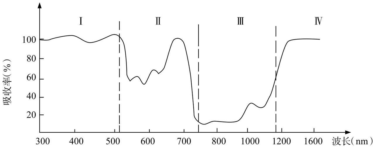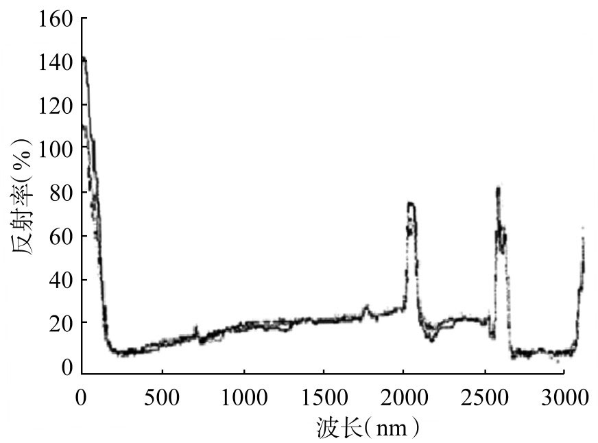 考虑植物方面的因素,激光杀灭蝗虫的同时要对蝗虫喜食性植物不造成危害。根据激光生物效应原理,光与生物组织的相互作用主要表现为靶组织对光子的吸收以产生某种组织的生物效应。蝗虫机体组织对光子能量的作用主要表现在红外波长段,不同组织对相同波长的激光吸收能力不同,产生的热效应也不同。一般植物对光的吸收波长如图1所示[1],东亚飞蝗以及其喜食禾本科植物芦苇的光谱效应曲线分别如图2和图3所示[2]。
