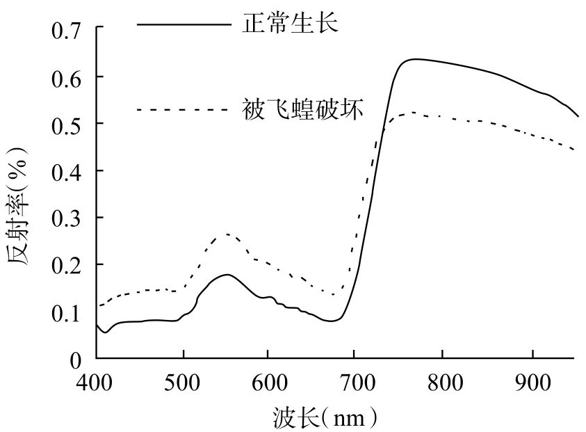 可以看出,在700~1200nm的红光和近红外光波段,植物对光的吸收水平处于低谷,也就是植物对近红外光具有高的反射率;并且无论是被飞蝗破坏的芦苇还是保持完好芦苇叶片的芦苇植物,对这样的近红外波段光的反射都处于高峰;而东亚飞蝗在这样的近红外波段对光的反射率低,也就是说具有强的吸收。此外,发生蝗灾的群居型蝗虫体色多为黄褐色或深褐色等深色体系,色素越深,对红外激光的吸收越多。由此,选择近红外波段激光对蝗虫和其喜食植物辐照时,可以保证植物的低吸收率和蝗虫的高吸收率,并且只要选择合适的激光波长和剂量对灾害蝗区进行辐照,就能确保在不影响作物生长的同时杀灭蝗虫。