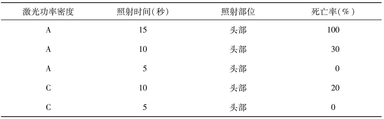 表2示出了亚洲小车蝗三龄期后蝗蝻在不同激光功率密度作用下的激光诱变致死效果。可以看出,高功率密度的激光A级、B级在适当增加辐照时间的条件下,能够实现蝗蝻的有效诱变杀灭致死,并且低功率密度的激光辐照C级也能够实现蝗蝻的部分诱变杀灭致死。
