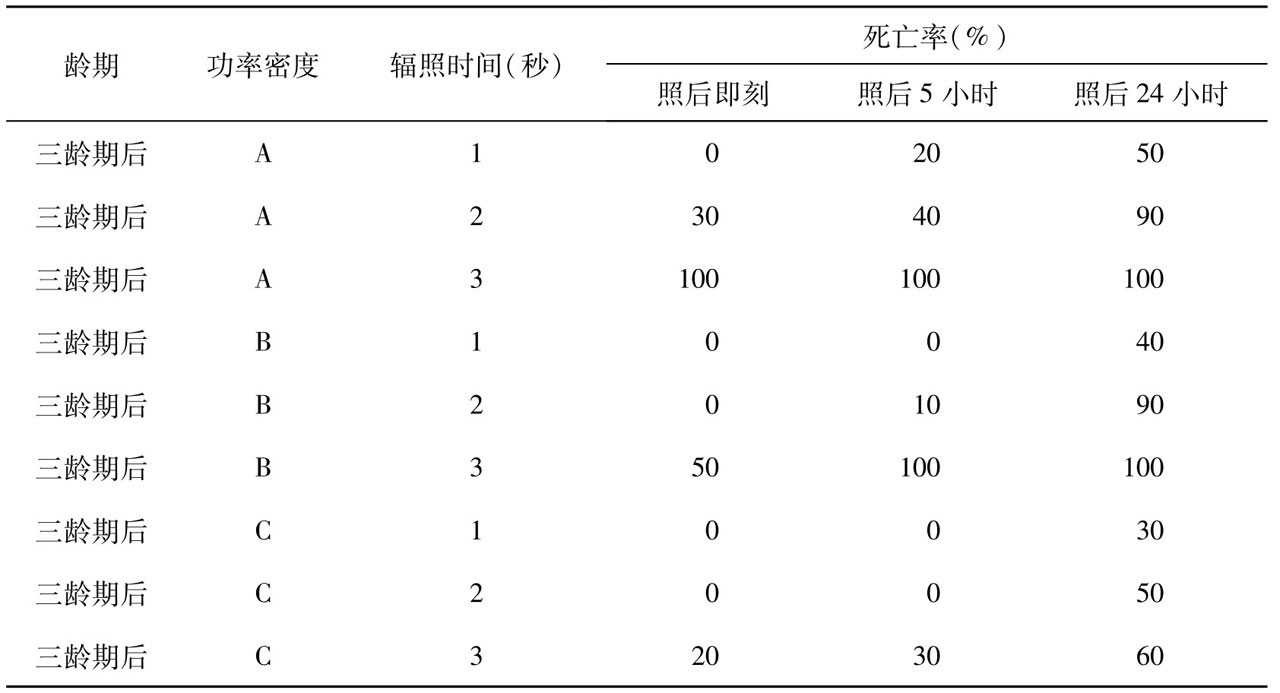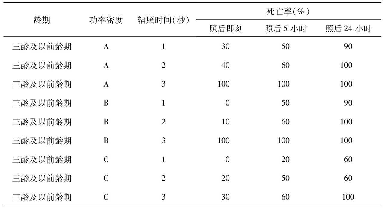 表3示出了亚洲小车蝗三龄及以前龄期蝗蝻在不同激光功率密度作用下的激光诱变致死效果。很明显,高功率密度的激光A级、B级很易于实现蝗蝻的有效诱变杀灭致死,同时低功率密度的激光辐照C级在适当延长辐照时间的情况下同样能够实现蝗蝻的有效诱变杀灭。