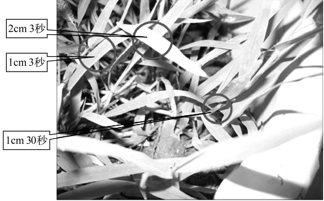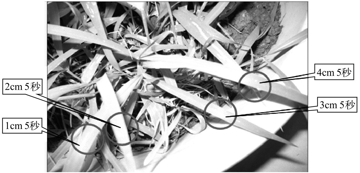 考虑蝗虫的生存环境和取食习性,试验选择了狗尾草作为蝗虫生存的背景植物,进行激光辐照效应对比研究。图5和图6呈现出了激光辐照狗尾草不同植株叶片和茎秆的实验结果,1cm、2cm、3cm、4cm分别代表着激光功率密度15.702W/cm2、3.926W/cm2、1.745W/cm2、0.981W/cm2、0.628W/cm2;5秒、3秒代表着激光对叶片的辐照时间,30秒代表着激光对茎秆的辐照时间。试验结果表明,辐照之后7天观测不到任何叶片和茎秆的生长异样,即使是高功率密度和长时间对秆茎的辐照也未能产生生长破坏。