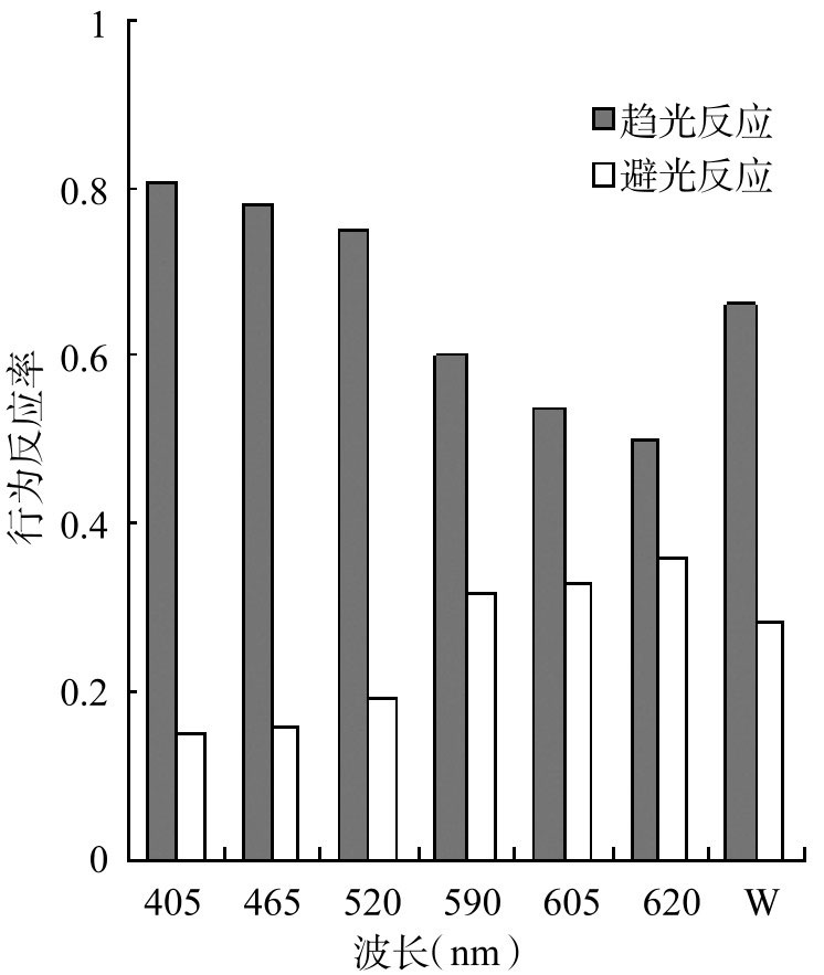 图7示出了东亚飞蝗成虫的趋光和避光行为反应。可以看出:在405~620nm波谱范围内,蝗虫的趋光行为反应率表现为随波长增加,反应率减小的趋势。该结果与电生理研究结果[5]基本吻合,但存在差异在于行为反应在紫光部分反应率较蓝光高,但在电生理研究中在蓝光区形成了峰值,暗示了波长因素在决定趋光行为上的有限性和条件性[6]。趋光行为反应值表现较高的波长其避光反应值相对较低,这表明蝗虫的趋避光反应行为具有相反的波长选择机制。