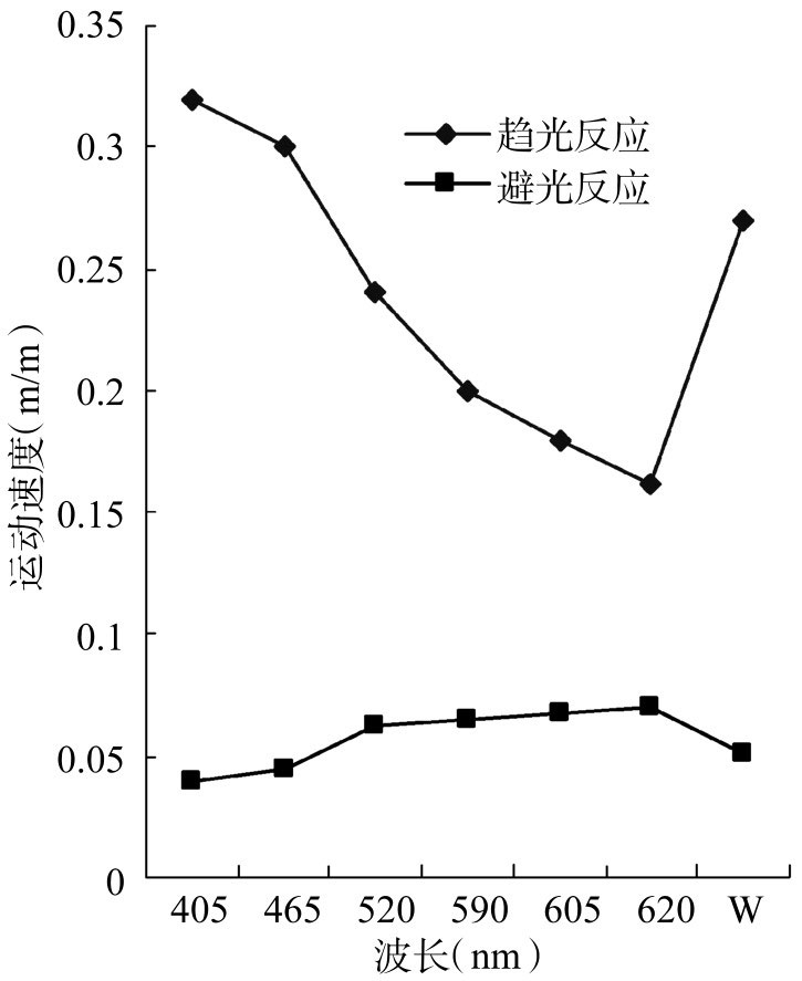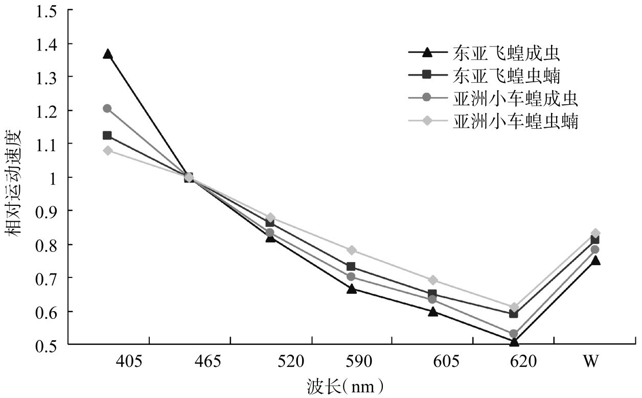 图8示出了蝗虫的活动能力与光波波长的关系。很明显,趋光运动速度随着波长的增加而减小;避光运动速度随着波长增加而增加。但趋光运动速度受光谱变化影响较大,避光运动速度受光谱变化影响较小;重要的是各种光波波谱条件下,蝗虫的趋光运动显著大于避光运动,它与趋光行为反应率共同奠定了蝗虫趋光诱导的可能性。