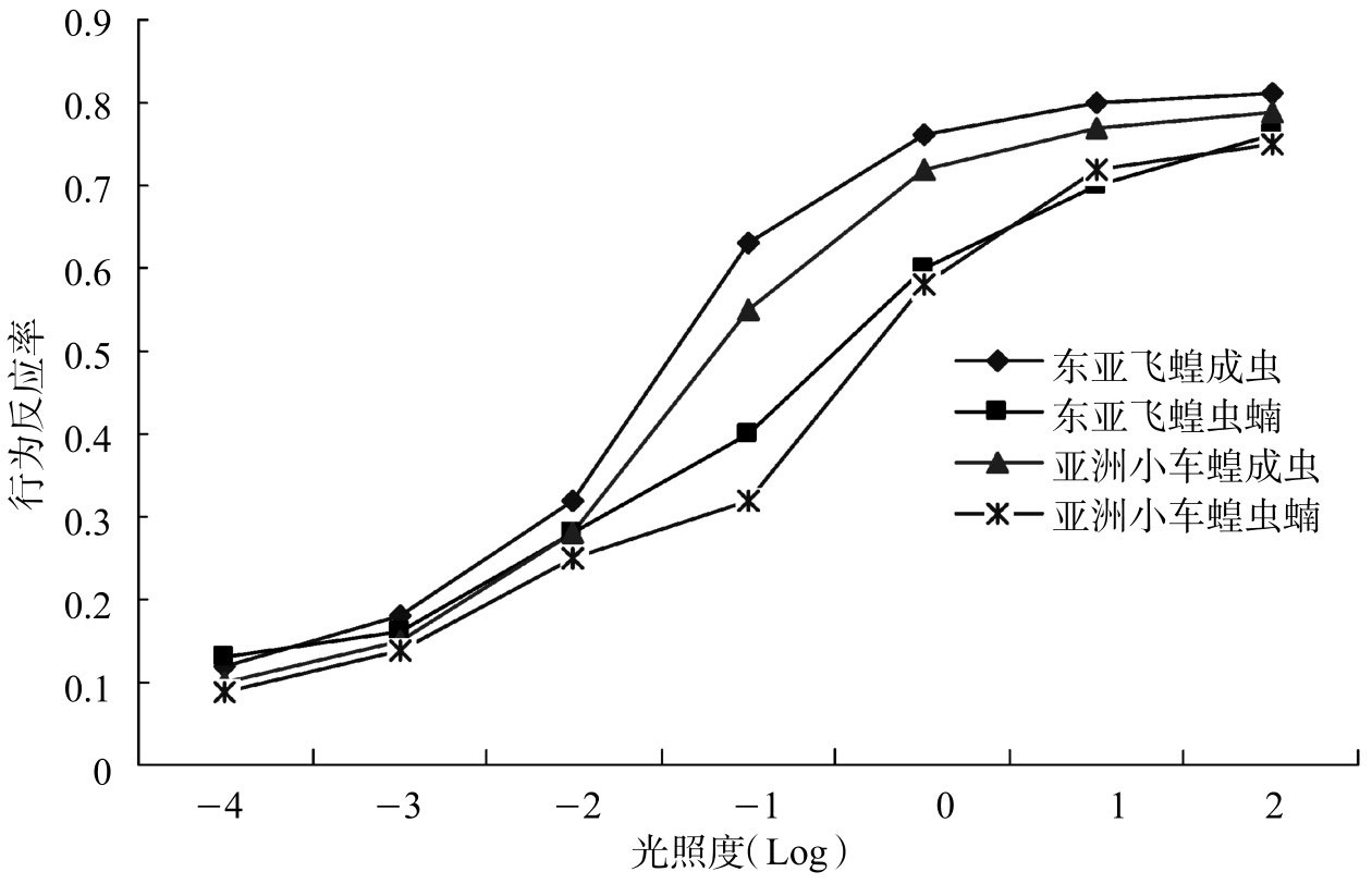 图10表明了蓝光光照强度对蝗虫成虫和蝗蝻的趋光反应行为影响。无论是东亚飞蝗还是亚洲小车蝗,在各个光照强度条件下蝗虫成虫的趋光反应率普遍高于蝗蝻的趋光反应率,并且蝗蝻的趋光反应率滞后于成虫大约1~2个数量级的光照强度。表明不同的发育阶段及生理状态对蝗虫趋光行为有不同影响,蝗虫成虫具有明显高于蝗蝻的光谱强度敏感性。