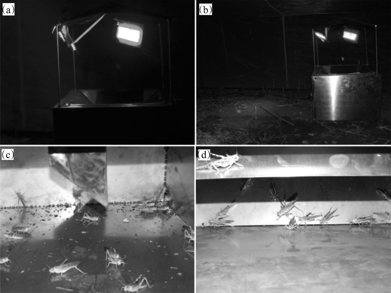 (a)~(b)试验过程(c)~(d)捕集到的蝗虫