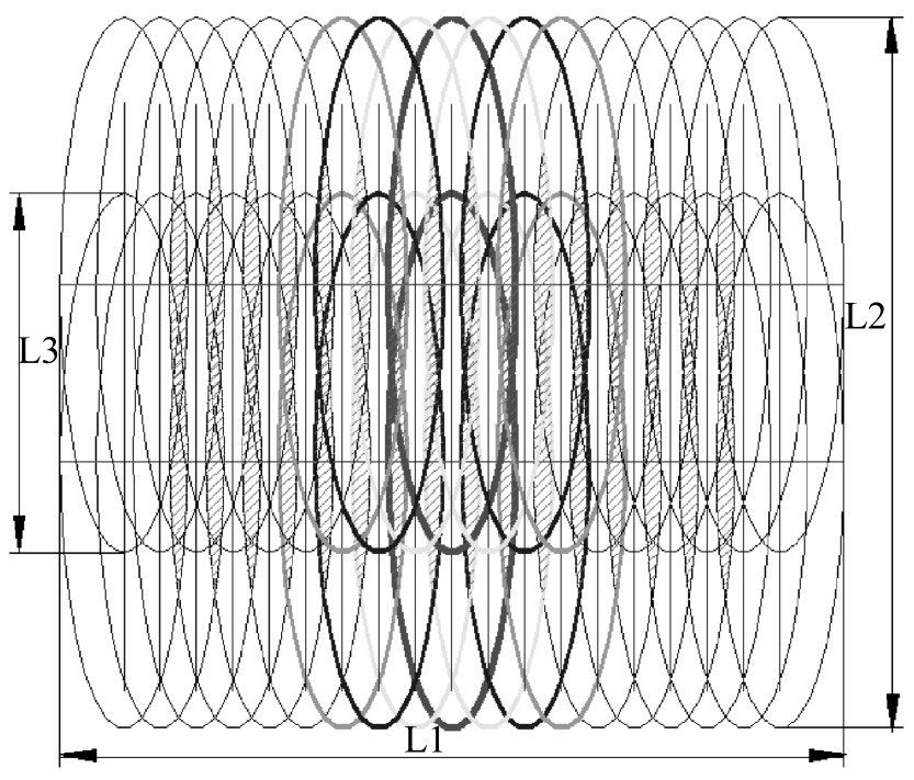 图13为4个叠层列阵激光器组成的阵列结构激光杀灭器效果简图,其发光光束示意图如图14所示。可以看出,由于激光器的密集阵列,激光束产生层叠,对形成的大光斑中的局部区域的光密度具有增强作用;如果激光光斑之间不能相交,辐照区域将会有一定范围的空缺。
