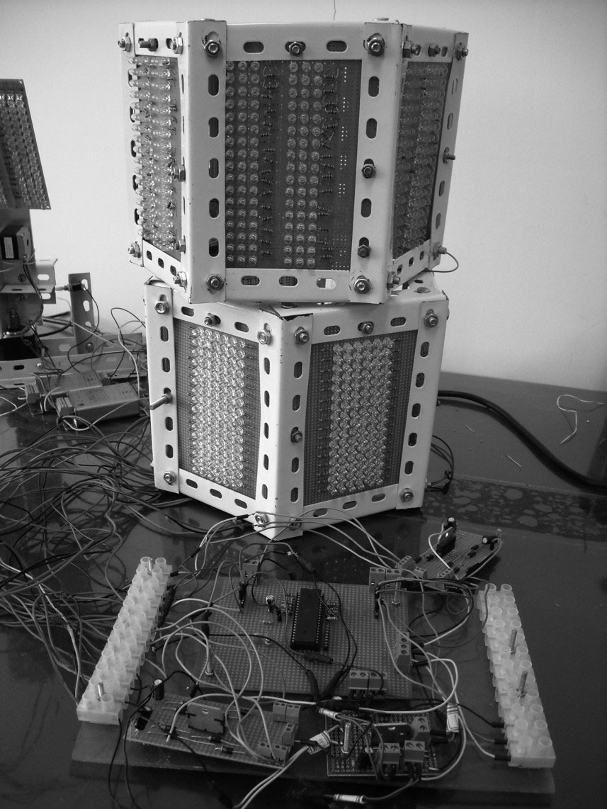 设计了能够实现一定半径内的圆周照射整体式光电诱导光源和旋转照射平板式光电诱导光源以及专门的控制装置,实现多种可变的光电诱导刺激,如交变光场、频振光场、流动光场。整体式光电诱导光源的组成如图15所示,包括以下方面:LED阵列集成发光装置、LED阵列驱动装置、单片机系统控制装置等。