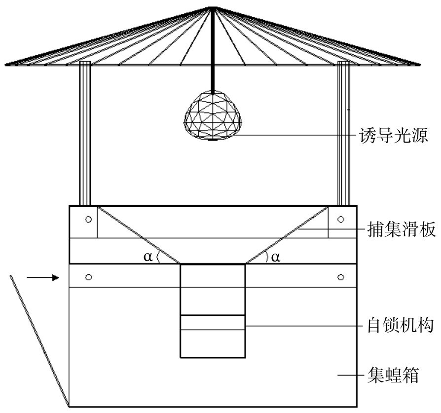蝗虫滑移捕集机要能够实现趋光聚集而来的蝗虫的滑移捕获收集,就应该具备漏斗式的捕集装置。图16示出了一种漏斗式的光电诱导滑移捕集机。当蝗虫趋光降落或通过辅助板爬向诱导光源处时,具有超滑功能的捕集滑板就会滑落蝗虫,经过自锁封止机构跌落于集蝗箱。