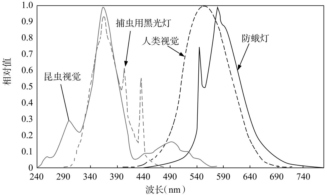 图2 人类标准分光视觉、昆虫分光视觉特性以及捕虫用黑光灯和防蛾灯的分光分布