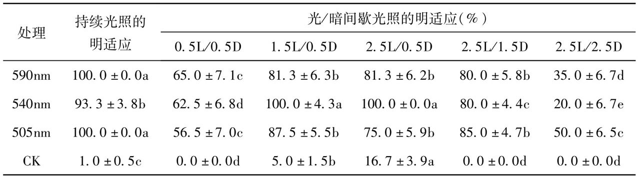 根据光谱范围对植物生理影响的论述[12]和蛾类在500~560nm有一个敏感区,段云等研究了505nm、540nm、589nm三个波段可以调节光照度和间歇照明频次的LED灯对棉铃虫明适应的影响[13],结果见表1。由表1可以看出,505nm、540nm、589nm三个波段持续光照可以极其有效地保持棉铃虫的明适应状态,并以589nm黄色光波段最好。间歇光照的频次,黑暗的时间不能超过0.5秒,光照时间必须超过1.5秒,才能有效地保持棉铃虫的明适应状态,从而在棉铃虫种群的控制中发挥其潜力。