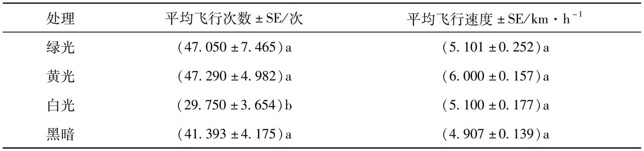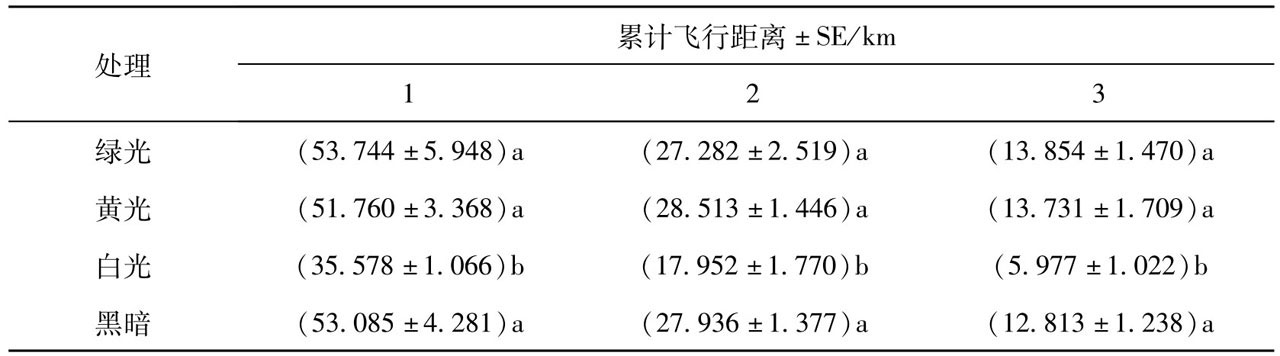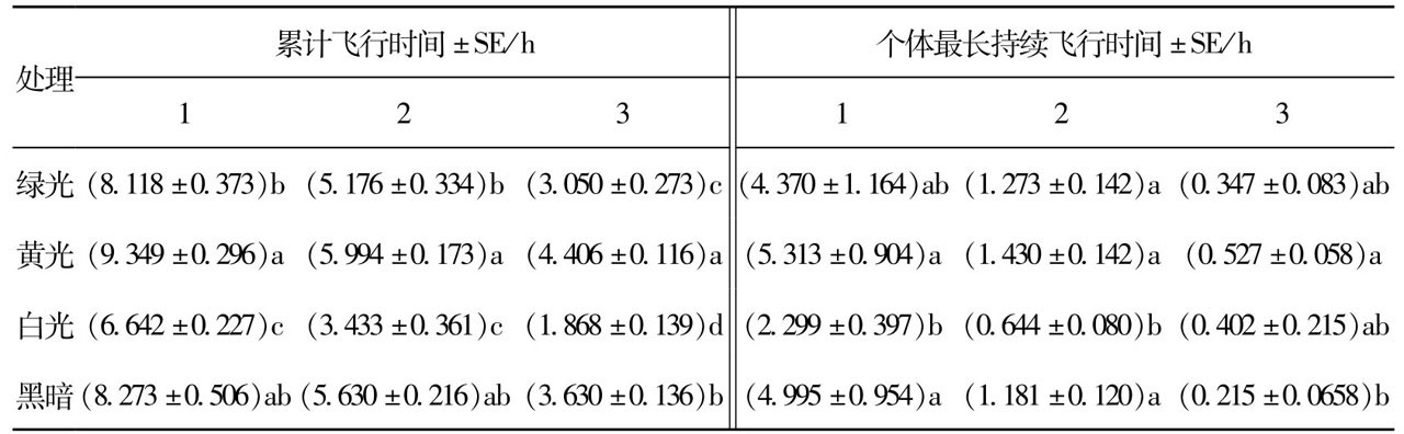 由以上结果可知,在相同光照强度范围内,单色光黄光、绿光对棉铃虫飞行次数影响不明显,白光照射下,与对照组黑暗相比,飞行次数显著减少,且与单色光处理差异显著;3种不同波长的光对棉铃虫的平均飞行速度均无影响;白光照射下棉铃虫的累计飞行距离最短,且与其他处理存在显著差异;同时,研究结果还显示,白光照射下,棉铃虫的累计飞行时间和个体最长持续飞行时间,均最短,个体最长持续停飞时间最长,且与对照有显著差异(表略)。