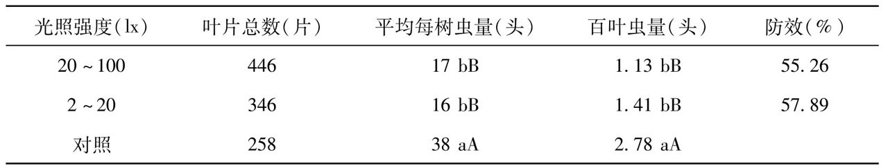 由表7.2可以看出,当光照强度在2~100lx时,对金纹细蛾的发生量都具有的控制作用,且在光照强度为2~20lx时,平均每棵树上的金纹细蛾百叶虫量为1.41,与光照强度为20~100lx时(百叶虫量为1.13)不存在明显差异。因此选用光照强度2lx以上时,就可以很好地控制金纹细蛾的发生。