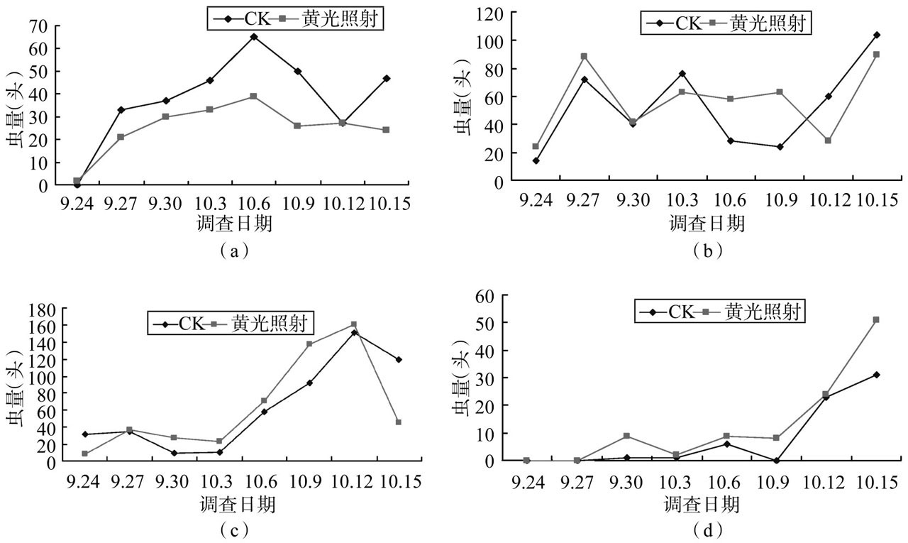 由该结果可以看出,黄光灯照射对白菜田鳞翅目害虫有明显的控制效果,在9月24日到10月15日调查期间,黄光灯照射的田间鳞翅目害虫数量明显低于对照,使用1周后鳞翅目害虫数量可以减少25%~50%。但对鞘翅目和刺吸式口器害虫数量影响不明显,与CK相比,对白菜田天敌的数量影响也不明显。