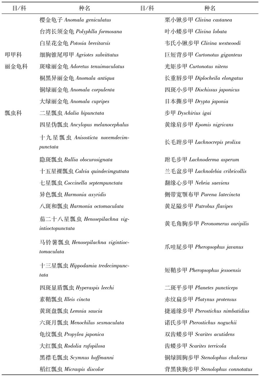 在超过5个科的目中,半翅目中以蝽科和猎蝽科为主,分别占37.04%和27.78%(表2)。鞘翅目中以步甲科、瓢虫科、天牛科和金龟子科为主,分别占39.39%、22.22%、8.08%和7.07%(图2A)。鳞翅目中以夜蛾科、螟蛾科和尺蛾科为主,分别占32.81%、12.50%和8.93%(图2B)。