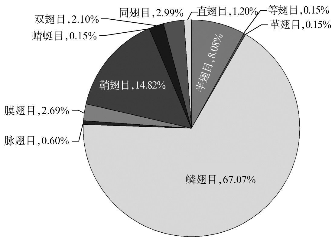 从图1可以看出,就各目的组成来看,鳞翅目>鞘翅目>半翅目>同翅目>膜翅目>双翅目>直翅目>脉翅目>等翅目、革翅目和蜻蜓目。从昆虫种的数量来看,鳞翅目448种,占67.70%;鞘翅目(99种),占14.82%;半翅目54种,占8.08%;同翅目20种,占2.99%;膜翅目18种,占2.69%;双翅目14种,占2.10%;直翅目8种,占1.20%;脉翅目4种,占0.60%;其余为等翅目、革翅目和蜻蜓目,均为1种,所占比例均为0.15%。