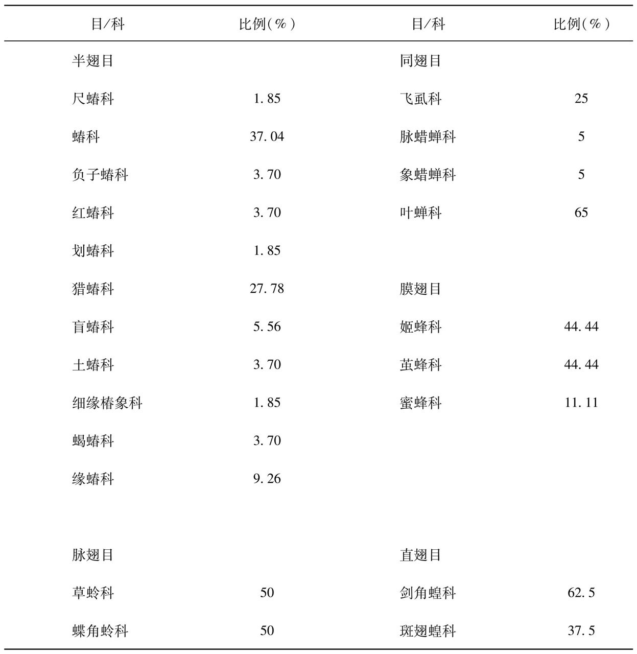 表2 灯下昆虫半翅目、脉翅目、膜翅目、同翅目和直翅目中各科所占的比例
