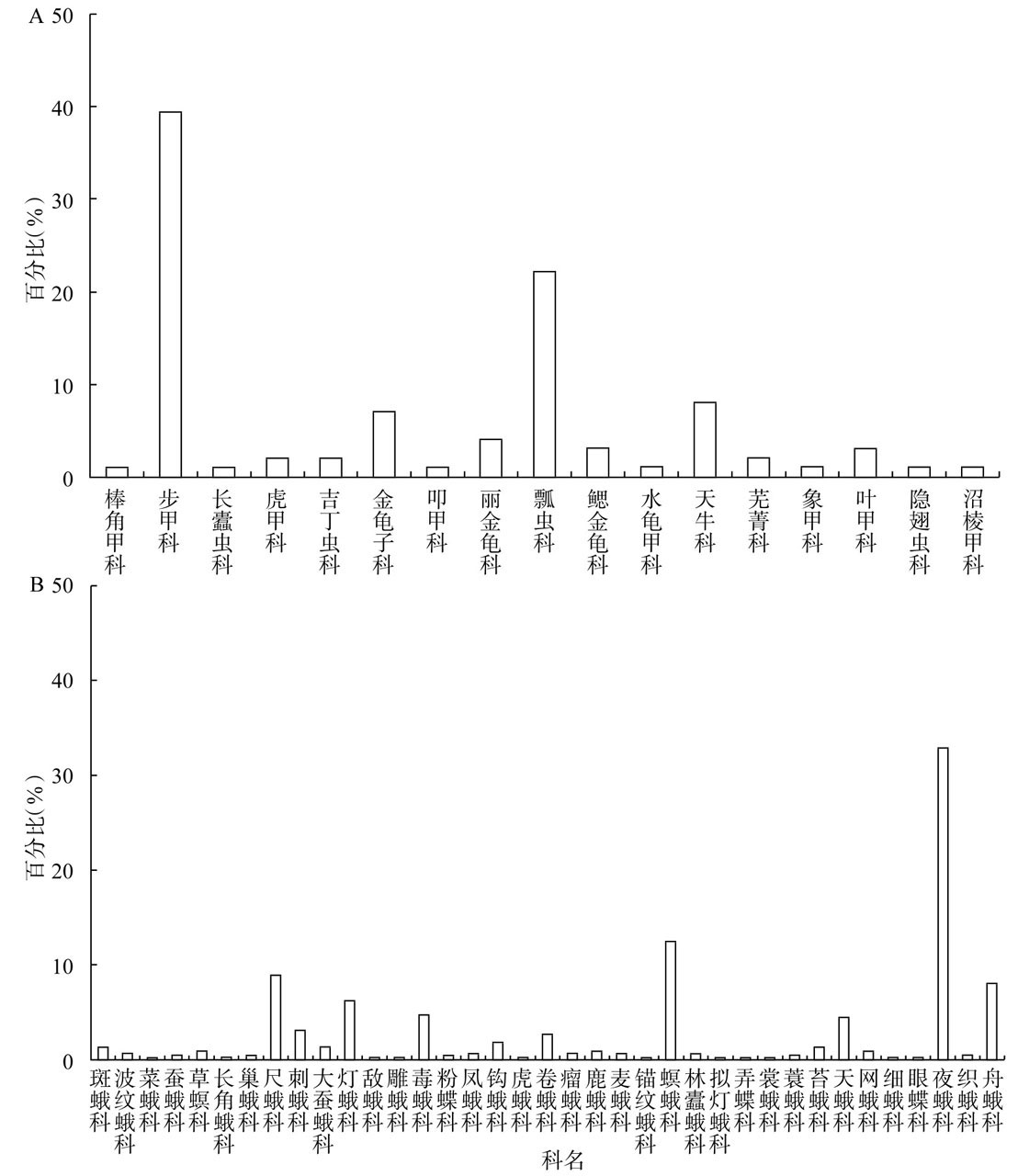 图2 灯下昆虫鞘翅目(A)和鳞翅目(B)各科所占的比例