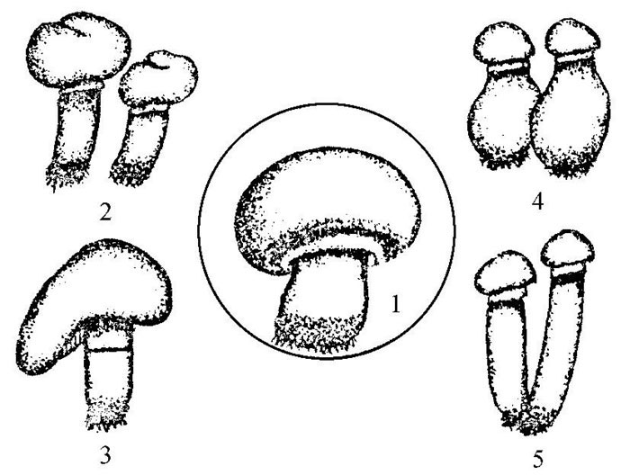 1.正常蘑菇 2.菌盖不规则 3.菌盖歪斜 4.盖小柄粗 5.盖小柄长