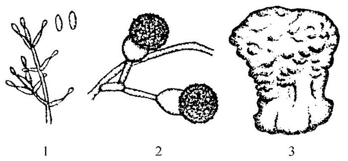 1.单细胞分生孢子及其分生孢子梗 2.双胞分生孢子 3.未分化的病菇