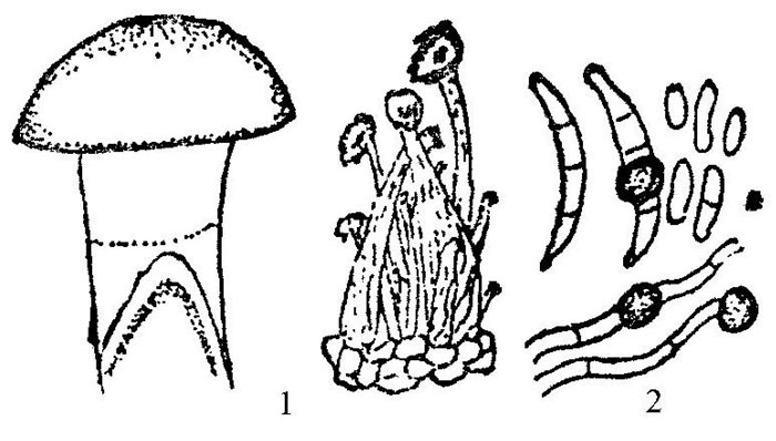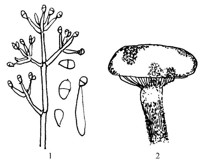 1.病毒颗粒 2.柄呈桶状的病菇 3.盖小柄长的病菇