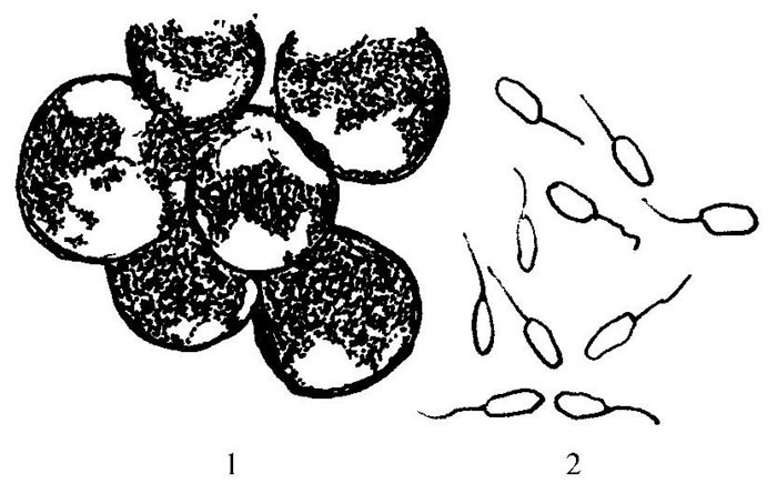 1.病菇症状 2.病菌的2种分生孢子和厚垣孢子
