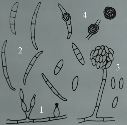 1—分生孢子梗;2—大型分生孢子;3—小型分生孢子及分生孢子梗;4—厚垣孢子