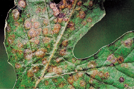 症状 又称西瓜、小西瓜靶斑病。过去该病主要发生在华东,近年华北、西北也有发生。主要为害西瓜叶片,初在染病叶片的正面生浅褐色小斑点,相对应的叶背面则出现灰白色的小斑,后逐渐扩展成直径1~3cm的大斑,以1cm的病斑居多。湿度大时,病斑表面可见灰褐色至暗褐色霉状物,即病原菌的分生孢子梗和分生孢子。
