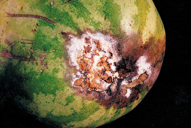 防治方法 ①在病瓜尚未长出粉红色霉层时就摘除,防其传播蔓延。②防止果实碰伤、擦伤,采收时最好用剪刀,避免用手拉扯造成伤口。③储藏时温度控制在12.5℃左右或20℃,可储藏1个月。
