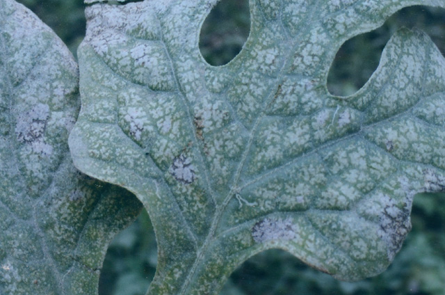 症状 西瓜进入果实膨大期后,基部叶片和叶柄的表皮硬化、粗糙,叶片绿色变浅,逆光观察可见叶脉间生浅黄色斑点,几天后产生一层白霜,叶片变得凹凸不平。