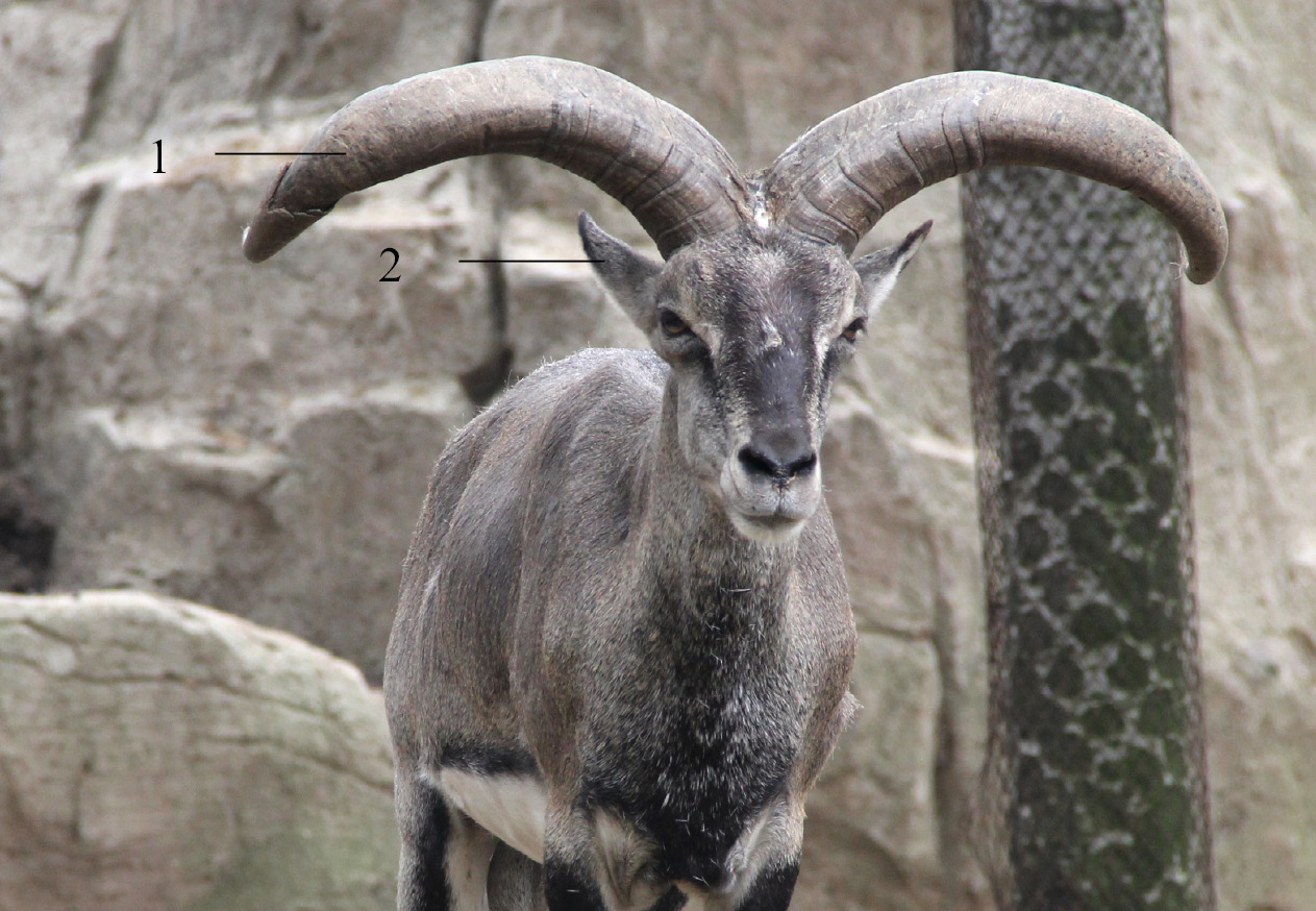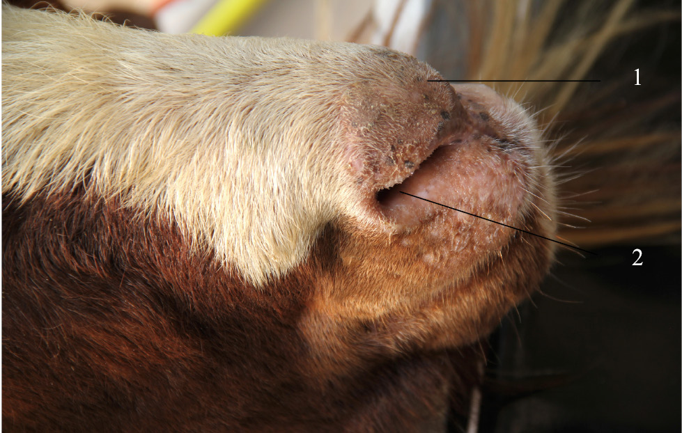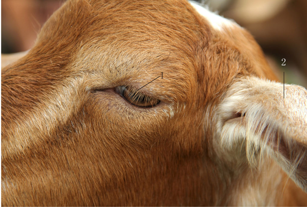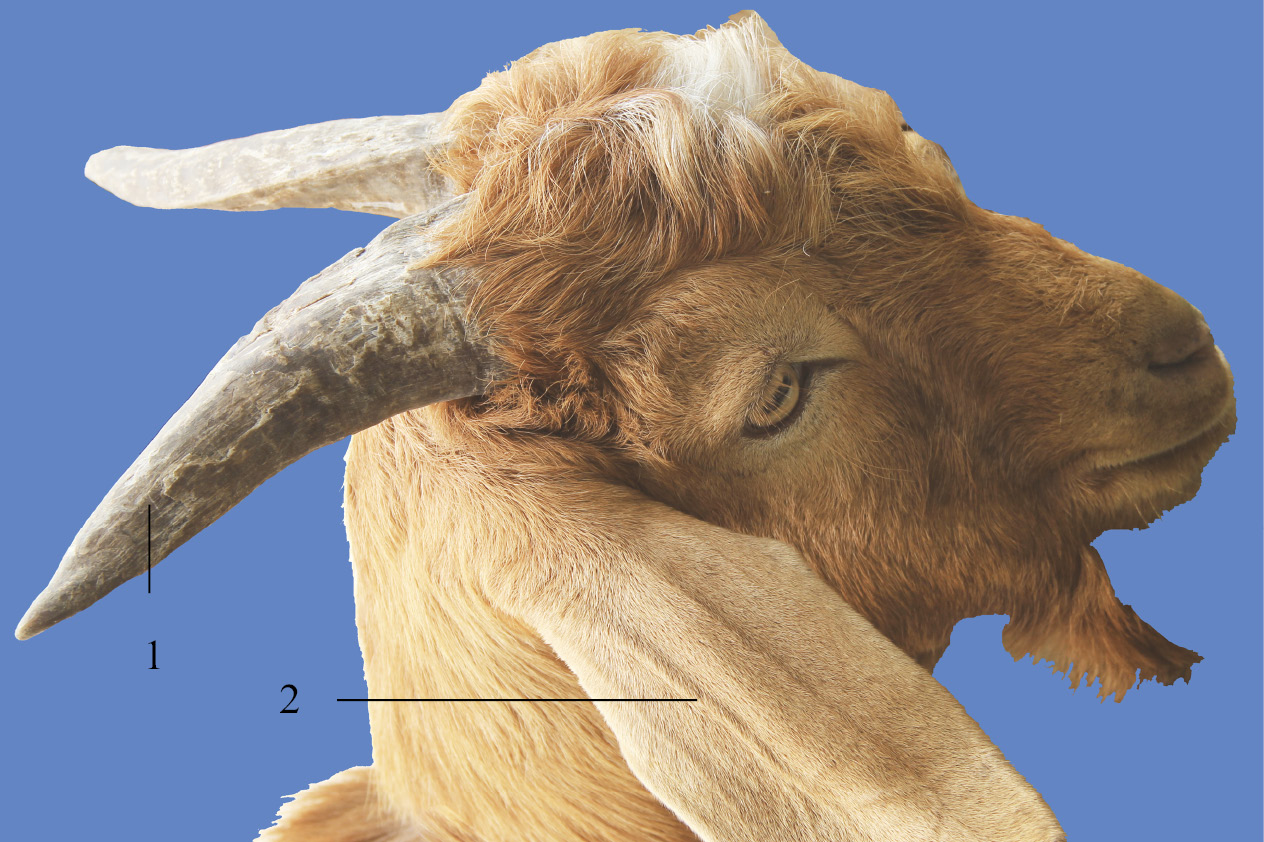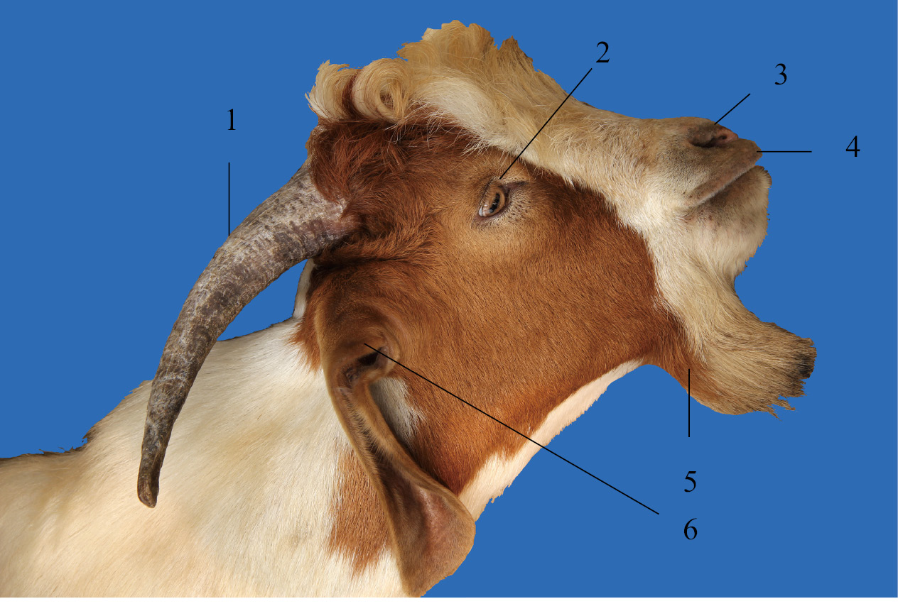1—角; 2—眼; 3—鼻镜; 4—唇; 5—胡须; 6—耳