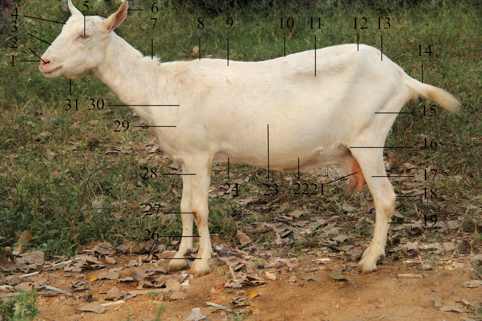 1—鼻镜; 2—鼻孔; 3—鼻梁; 4—额; 5—眼; 6—耳; 7—颈; 8—鬐甲部; 9—背部; 10—腰部; 11—肷部; 12—髋结节; 13—荐臀部; 14—尾; 15—股部; 16—膝关节; 17—小腿部; 18—跟部; 19—跖部; 20—后肢蹄; 21—乳房; 22—腹部; 23—肋骨部; 24—胸部; 25—前肢蹄; 26—掌部; 27—腕部; 28—前臂部; 29—臂部; 30—肩胛部; 31—胡须
