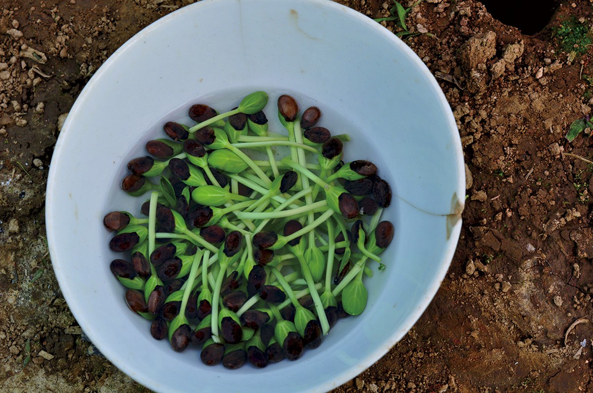 浸种后催芽。将浸透了的种子用湿布包好,甩去种包内多余的水后开始催芽。适宜温度为30℃左右,催芽期间每12 h左右用温水搓洗1次,搓洗后甩去多余的水,继续催芽。从浸种到种子出芽一般需要48 h左右,但也有的陈种子需要4~5 d才能出芽。大部分种子出芽后即可播种。