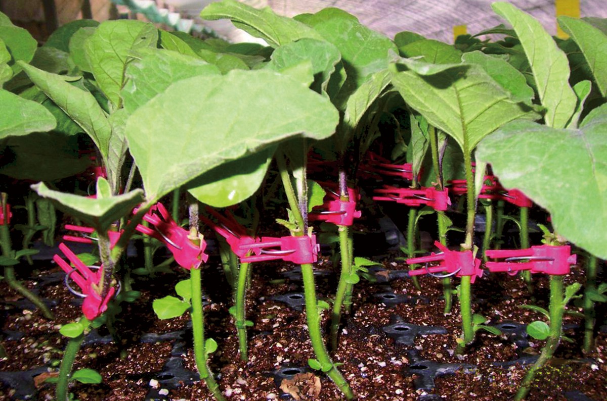 图2-16 茄子劈接后用嫁接夹固定状(来自网络)