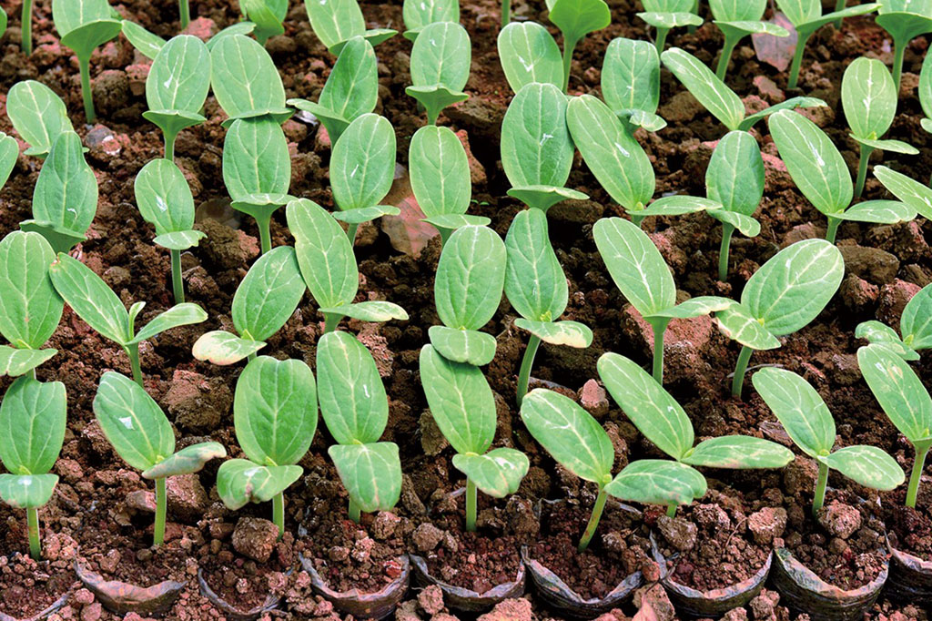 (3)砧木管理 黄瓜播种4~5 d后,再播种南瓜砧木,南瓜种子经浸种催芽长出1 cm长的胚根时播种。先向营养钵中喷水,水要浇透。用筷子在营养钵接近中央位置插孔,将南瓜种子胚根插入孔中,种子平放,然后用筷子将泥土弥合,再在南瓜种子上覆盖潮湿的营养土,形成一个小土堆,覆土量要尽量一致。