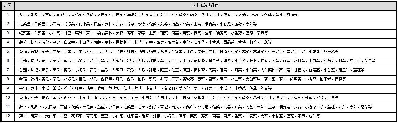 (2)种植种类和品种确定 考虑市场和消费需求,一般要求做到每个季节在地里生长的蔬菜15~20种,当季正收获的蔬菜10~15种,可满足不同消费者对种类和品种的基本需求(每月可产出的蔬菜见表1-1)。