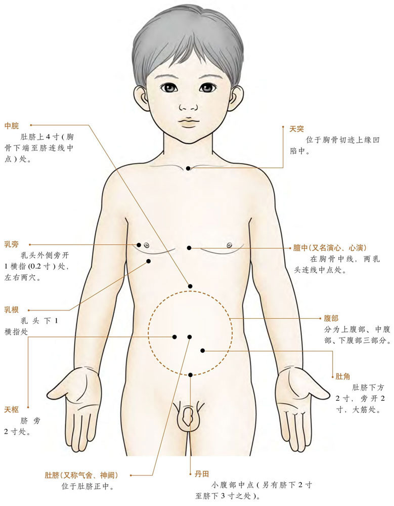 腹部位于胸腔与骨盆之间,人们常说的肚子基本上就是指这一块地方。人们常说,大肚能容天下之事,人体的腹部的确是“精英汇集”。按摩儿童腹部常用的穴位有以下几处: