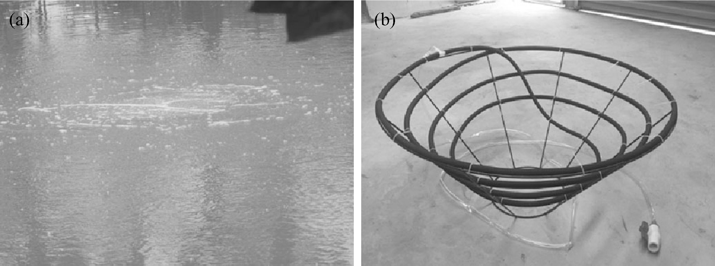 ②圆盘式 圆盘曝气器[图2-3(b)],其制作方法是用金属或塑料先制成圆形框架,圆盘直径1~1.5米,微孔管长一般是15~30米,把微孔管盘绕固定在框架内,进气管口留在圆盘中间,与支管连接进气,终端口封死,用支架和绳子安放底层水中。