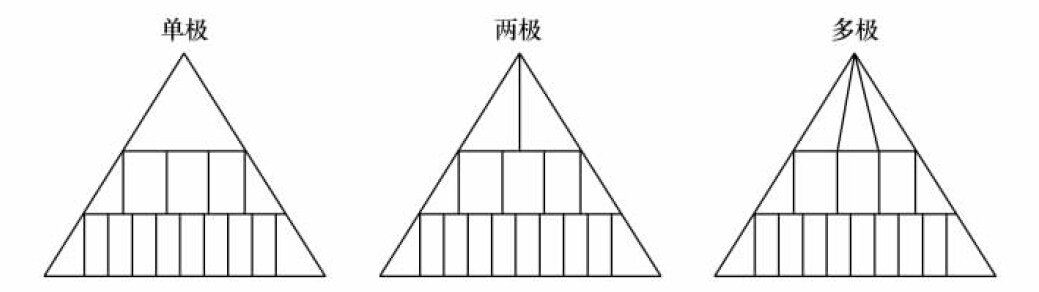 国际格局有单极、两极和多极三种形态(见图2-5)。这三种基本形态变化的根据是主导力量的变化,而中小国家的实力对比变化或它们与大国的关系变化都不会使国际格局发生质变。客观上,中小国家的实力是分散的,不可能团结成为一个有统一指挥的军事集团,其产生的合力远远小于一个独立的主导大国。