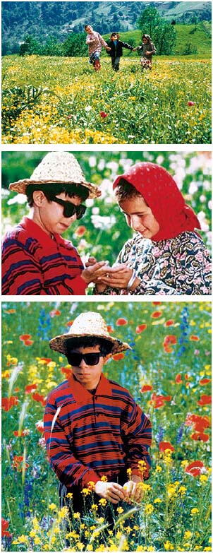 电影《天堂的颜色》画面盲童墨曼在开满鲜花的原野。