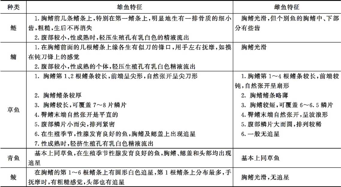 (4)雌雄鉴别 雄鱼身体狭长,腹部扁平;雌鱼身体宽阔,腹部饱满。鱼类在接近或达到性成熟时,在性激素的作用下,出现第二性征,特别在雄鱼身体上较为明显。这些第二性征有的终生存在,如鲢、鳙;有的在繁殖季节过后即消失,如草鱼、青鱼、鲮等。区别家鱼雌雄的方法基本相同,主要是从性腺发育良好的个体的胸鳍来区分,雌雄鱼的主要第二性征见表1-15。