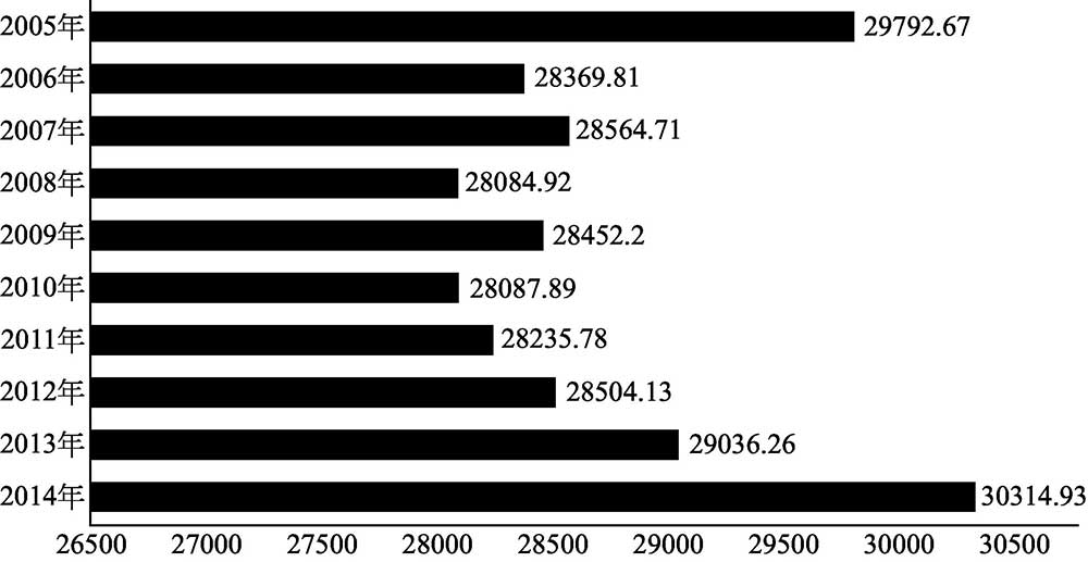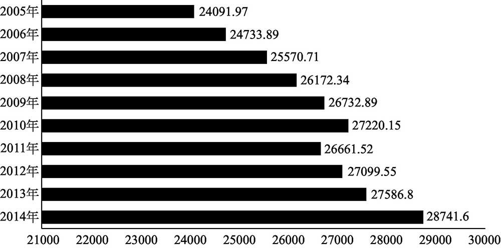 图1-2 我国2005~2014年羊的出栏变化情况(万只)