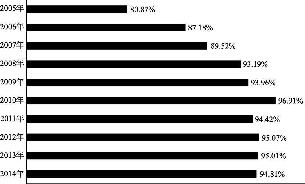 图1-4 我国2005~2014年肉羊出栏率变化情况