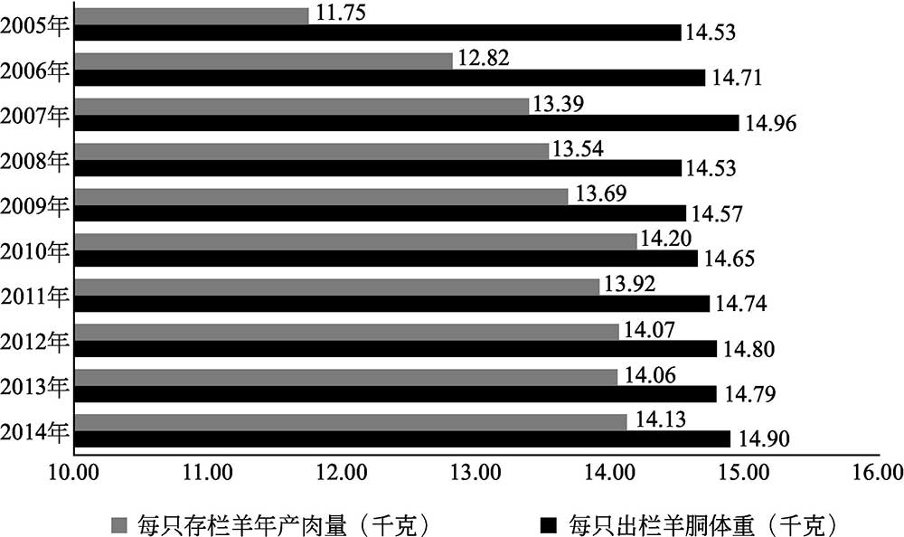 图1-5 我国2005~2014年每只出栏羊胴体重和每只存栏羊年产肉量变化情况