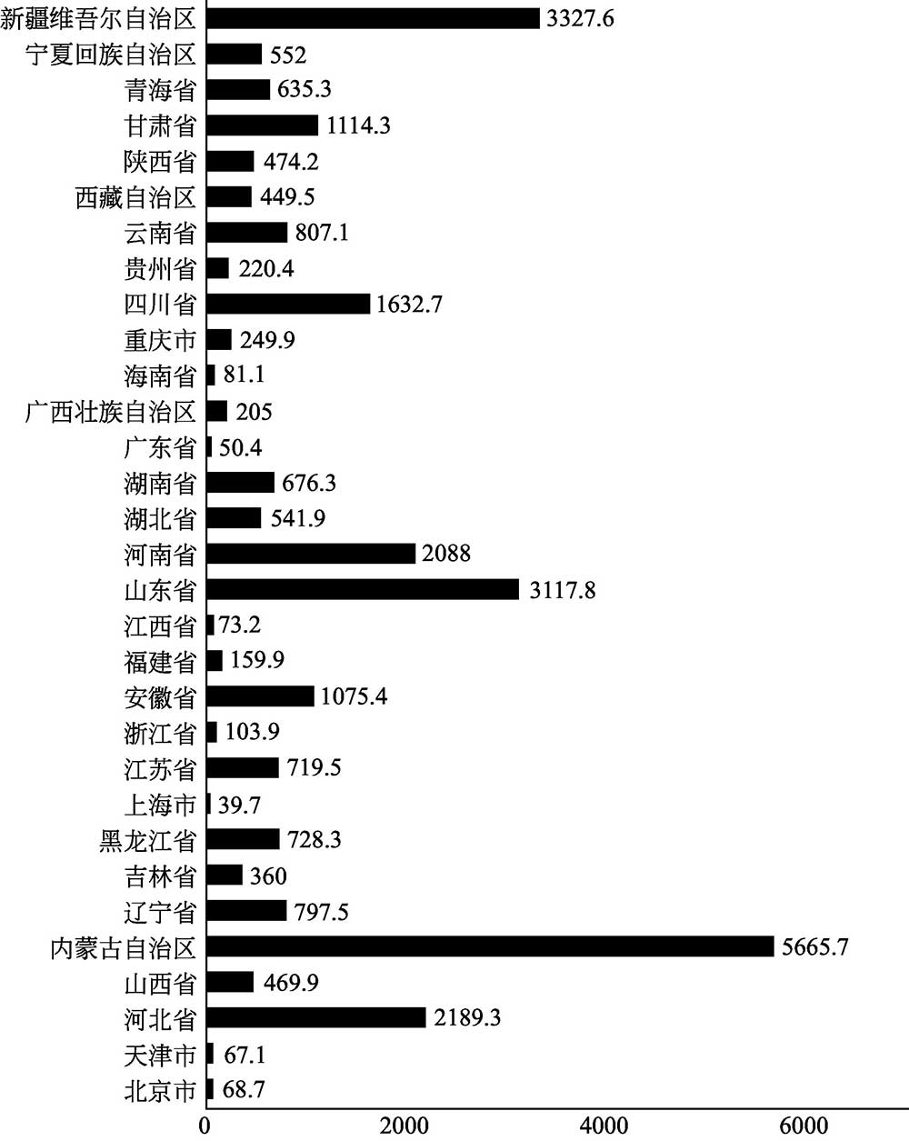 图1-6 2014年各省市自治区羊存栏量(万只)