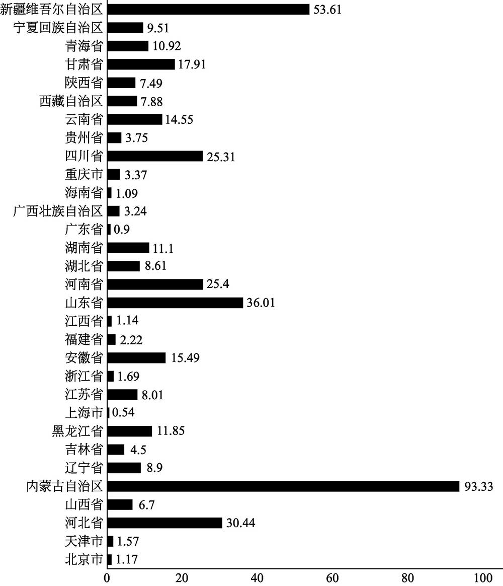 从生产区域的分布来看,我国基本上所有省区都生产肉羊,产区比较分散(如图1-6~图1-8所示)。从生产区域的变动来看,我国肉羊生产有进一步集中的趋势。绵羊养殖地区主要集中在内蒙古、新疆、甘肃、青海和西藏五大牧区,这五大牧区的绵羊存栏总量占全国绵羊总存栏量的比例一直在65%以上,成为我国绵羊肉的主产区。