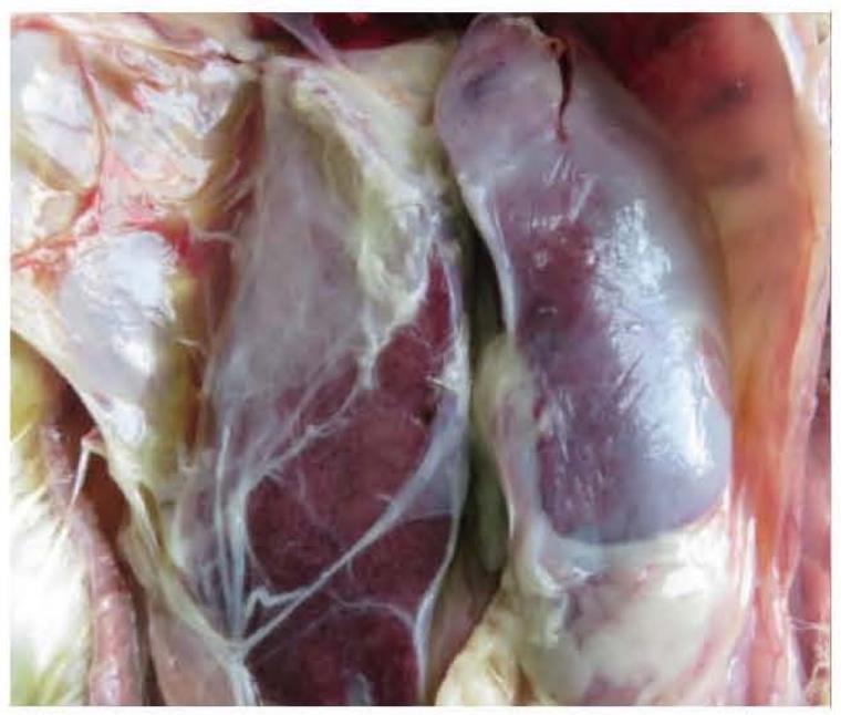 【病理变化】 除脱水和结膜发绀外,最明显的是心包腔内和肝表面纤维素附着(彩图47),渗出物中含有单核细胞和异染细胞;心外膜混浊、增厚,心包膜与心外膜粘连(彩图48);纤维素性气囊炎,气囊壁混浊、增厚;腹腔积水;慢性病例可见纤维素化脓性肝炎和脑膜炎;脾脏肿大、表面有灰色斑点;干酪样输卵管炎和关节炎。