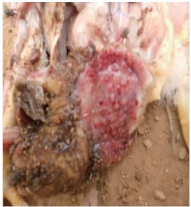 【病理变化】 全身消瘦或发育不良,肌肉苍白、松软,有的眼部肿胀,眼周围形成近似圆形的肿胀区,眼角有黏液性、脓性物,有的在眶下窦有干酪样物;口腔、咽喉和气管黏膜上有黄白色干酪样的伪膜,气味恶臭,不易剥脱;腺胃显著肿大,外观呈球型、半透明状(彩图1),腺胃乳头水肿、充血、出血,或乳头凹陷消失,周边出血、坏死或溃疡,腺胃乳头有脓性分泌物(彩图2);肌胃角质层增厚、易开裂,角质层靠近腺胃处有溃疡线,两侧或中间部分出现条纹或溃疡灶;肠道尤其是十二指肠有卡他性炎性病变,肠内充满液体(彩图3);肾肿大、有尿酸盐沉积。