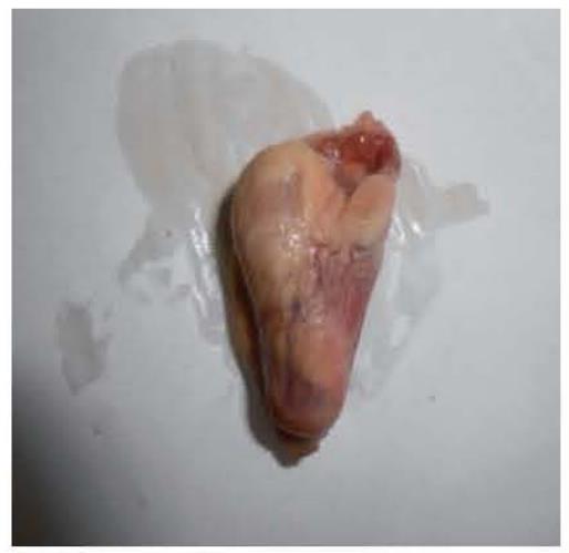 【病理变化】 全身皮肤发绀,嗉囊充满食物;整个腹腔干燥,腹壁紧贴脏器,腹膜表面和脏器浆膜之间及心包膜内有多量石膏样物沉着;心包内布满白漆状物质;肝脏肿大、外有白色物沉着;肾脏肿大,红白相间,外观呈槟榔花纹状;输尿管充满尿酸盐类白色物质;十二指肠黏膜有出血点和出血斑;气管黏膜出血,其中2只鸡气管内有大量黏液;胆囊充盈。